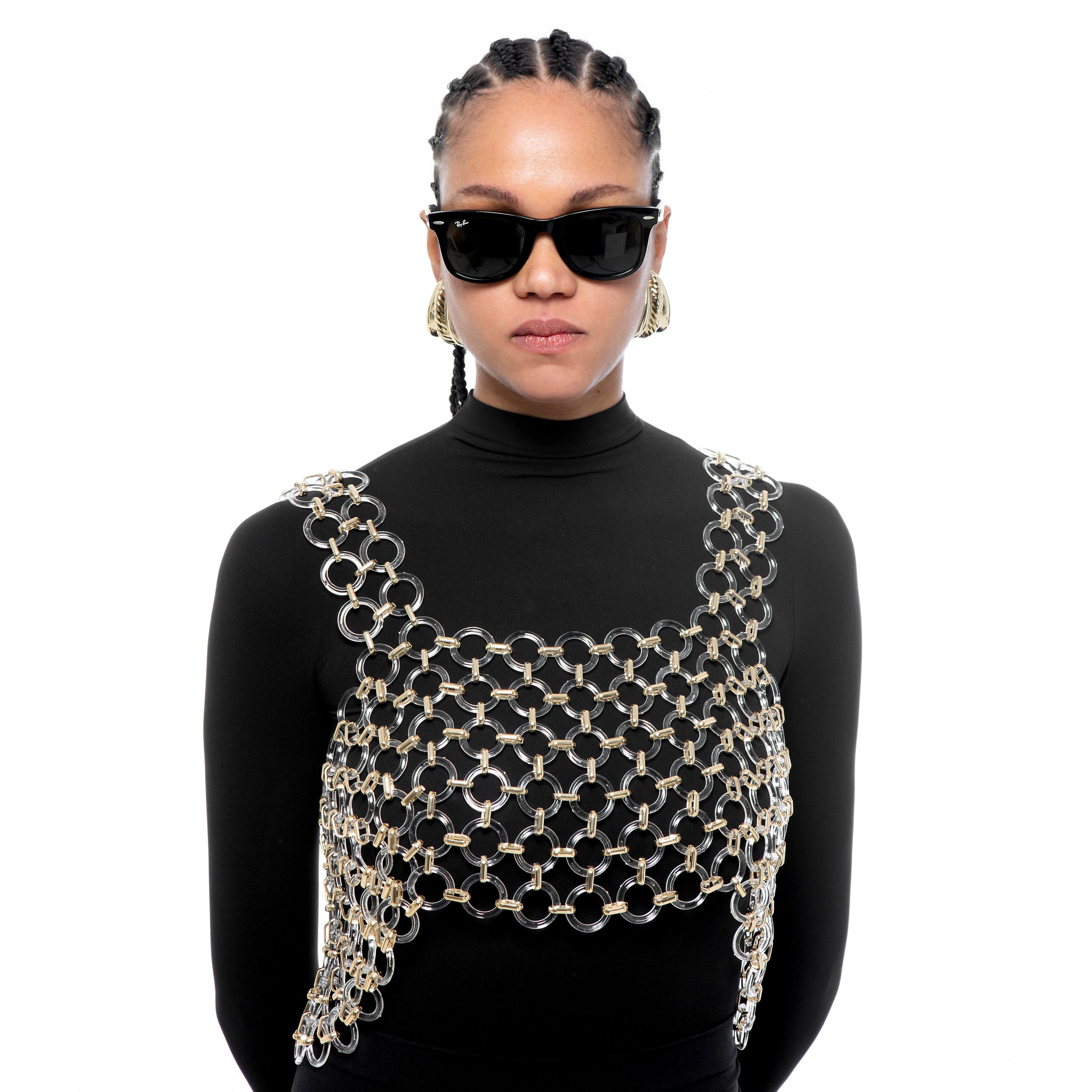 The Toffee Top reimagines the signature chain-link design in a cropped, sculptural form. Made from interlinked gold-plated brass and resin, it adds texture and shine to any look, worn over layers or on its own. Available in milk, amber, or transparent tones.