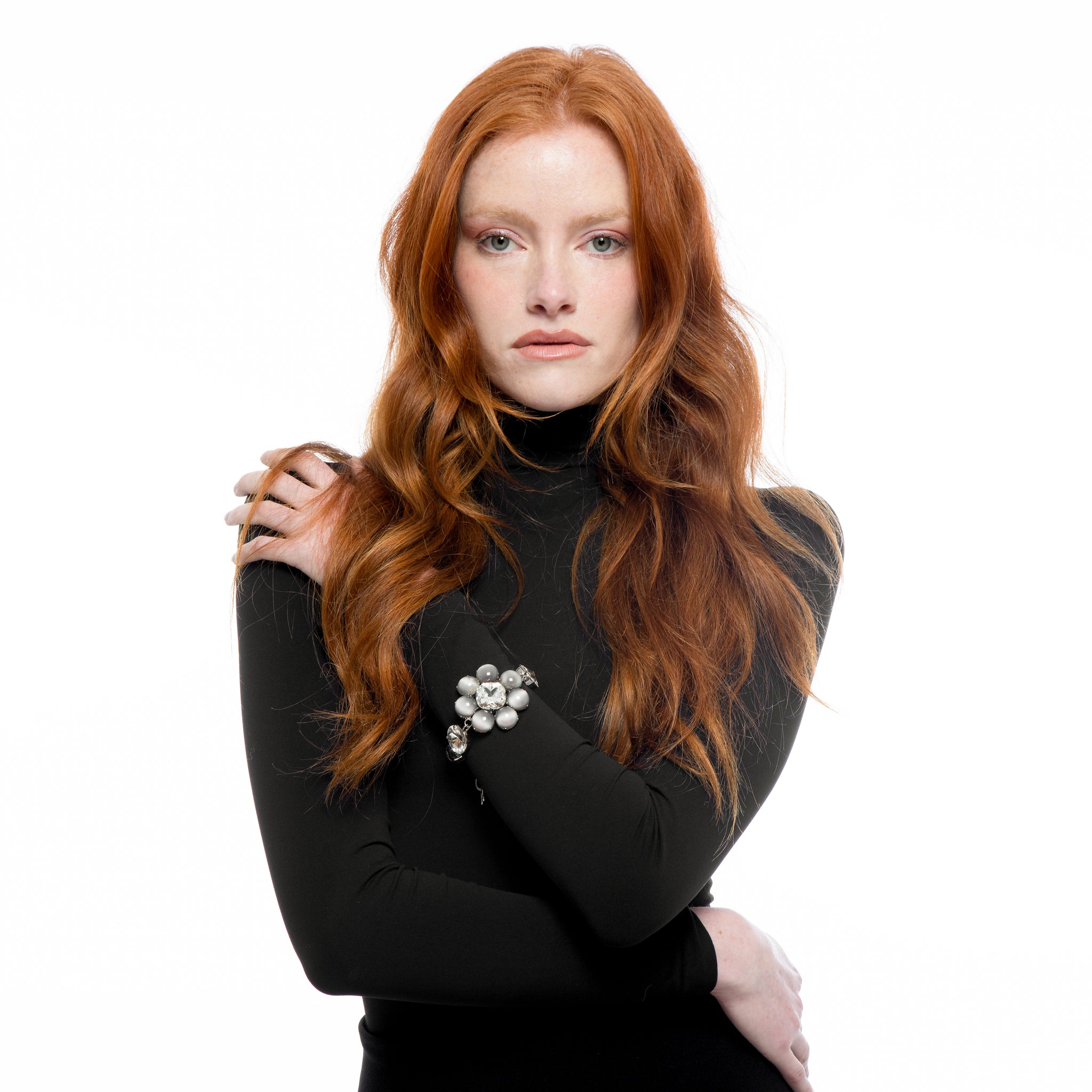 The Fiore Bracelet blends softness and structure through a floral-inspired design. Luminous pearls and faceted crystals form a sculptural composition that feels both refined and expressive. Available in gold and silver tones.