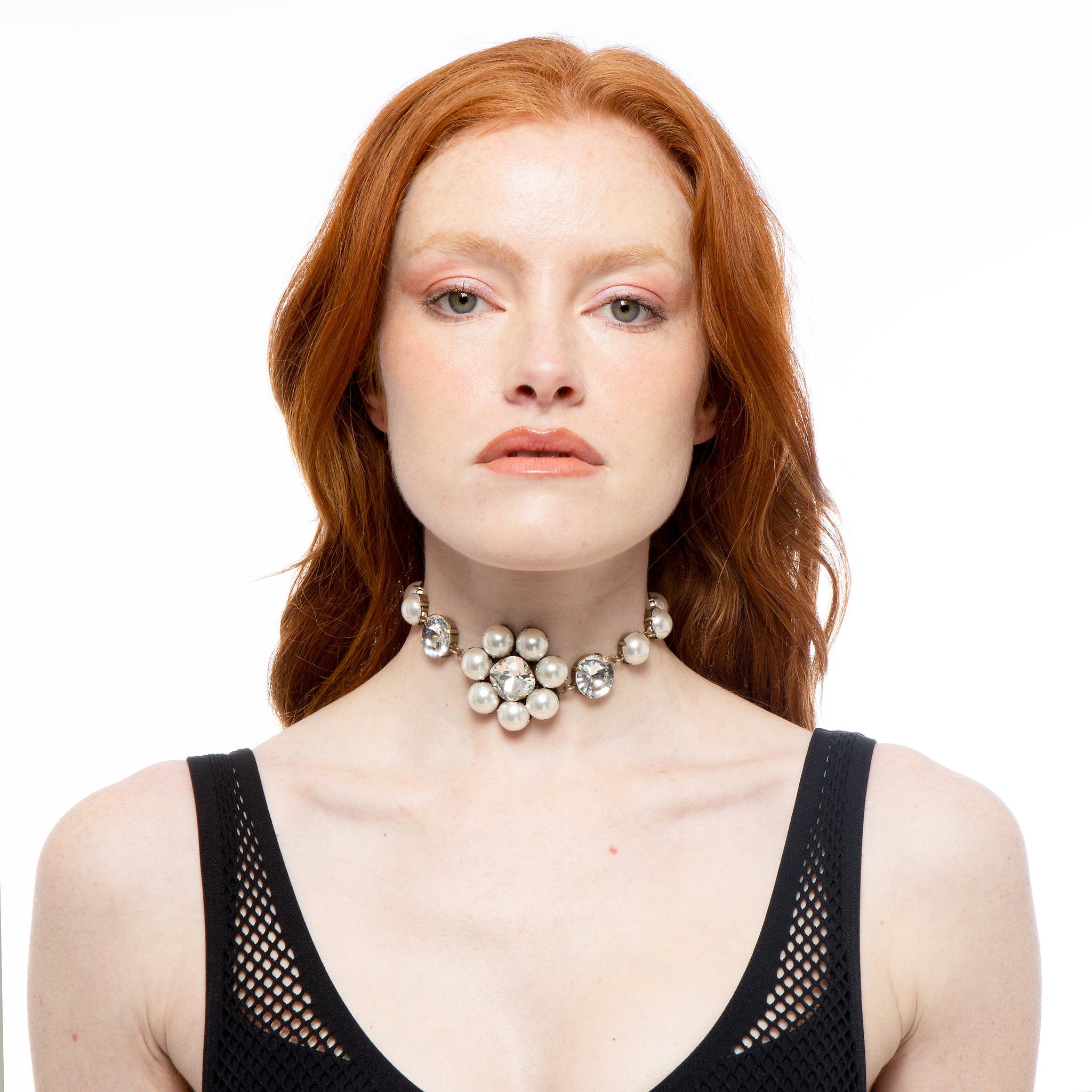 The Lula Necklace reinterprets classic femininity with a bold, sculptural edge. The design centers on a crystal flower framed by smooth, rounded stones that create subtle dimension and depth. Finished in gold or silver tones, it balances softness and structure.