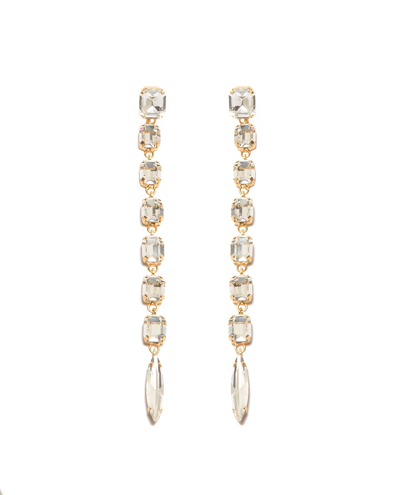 The Julie Earrings are elegant and easy to wear, featuring a straight line of clear crystals that create a refined and timeless look. Their long, balanced shape makes them perfect for both everyday wear and special occasions.